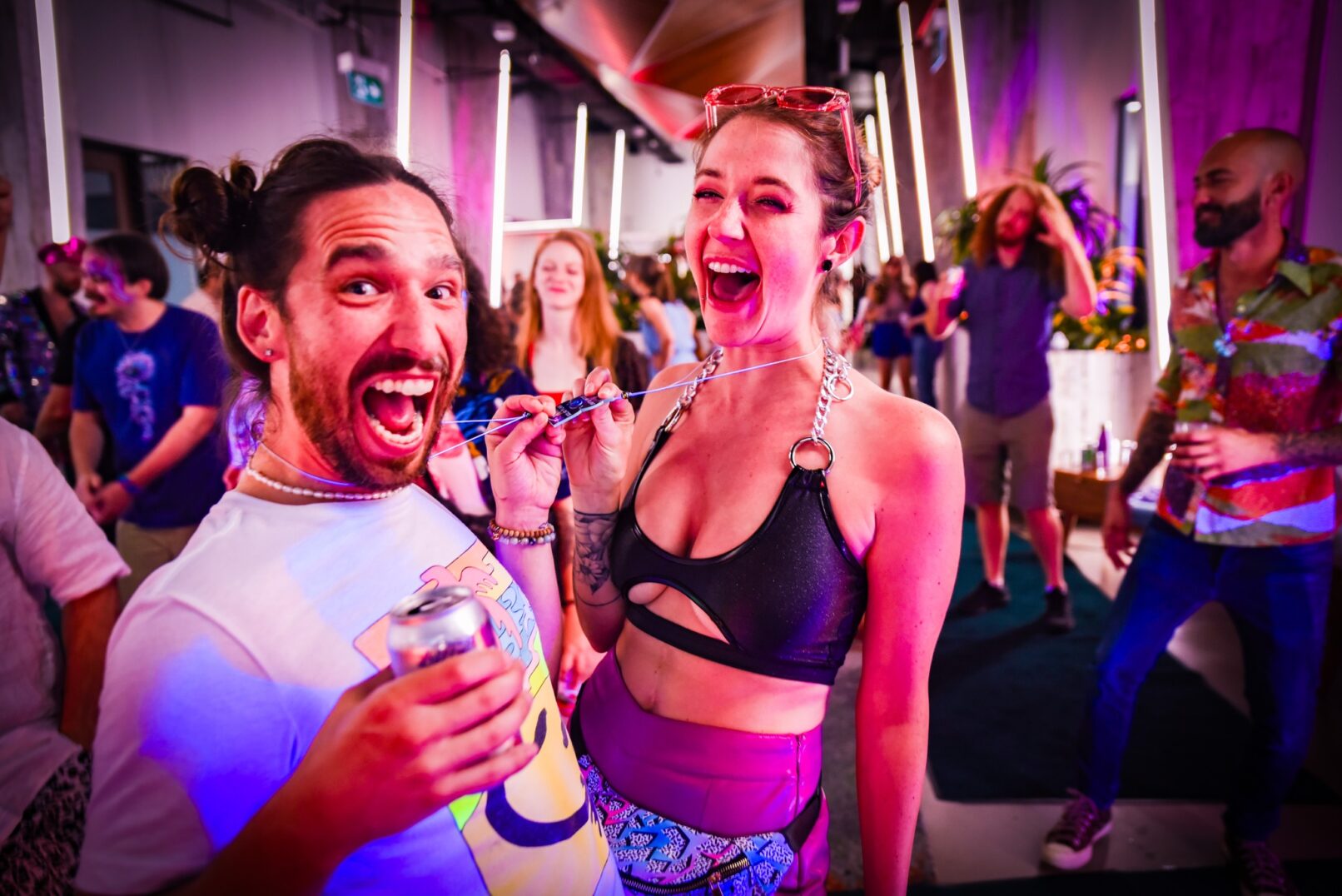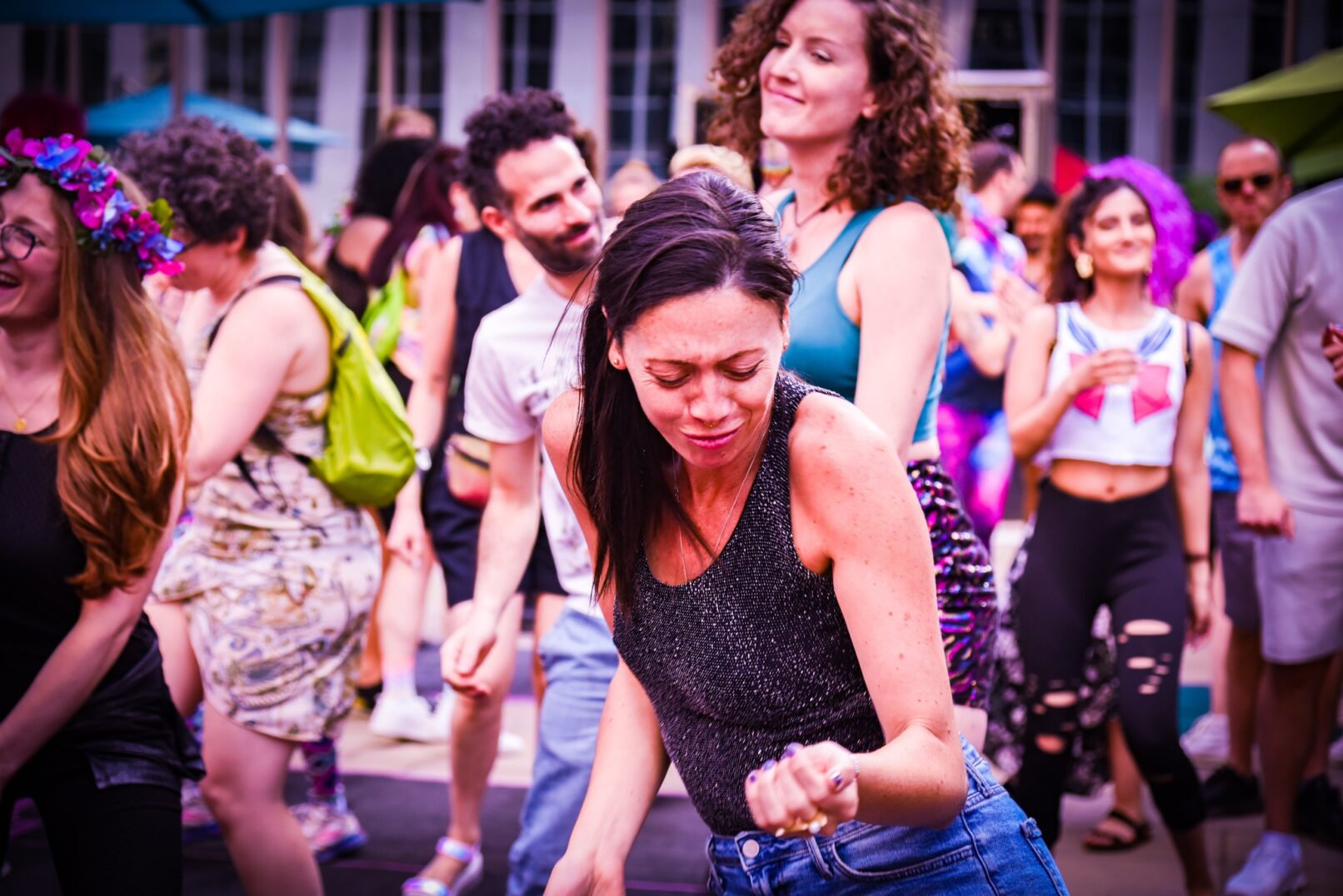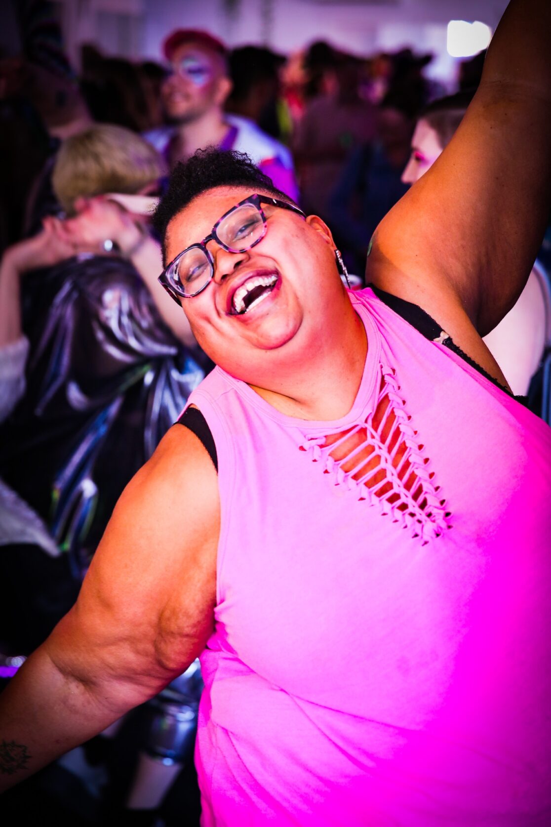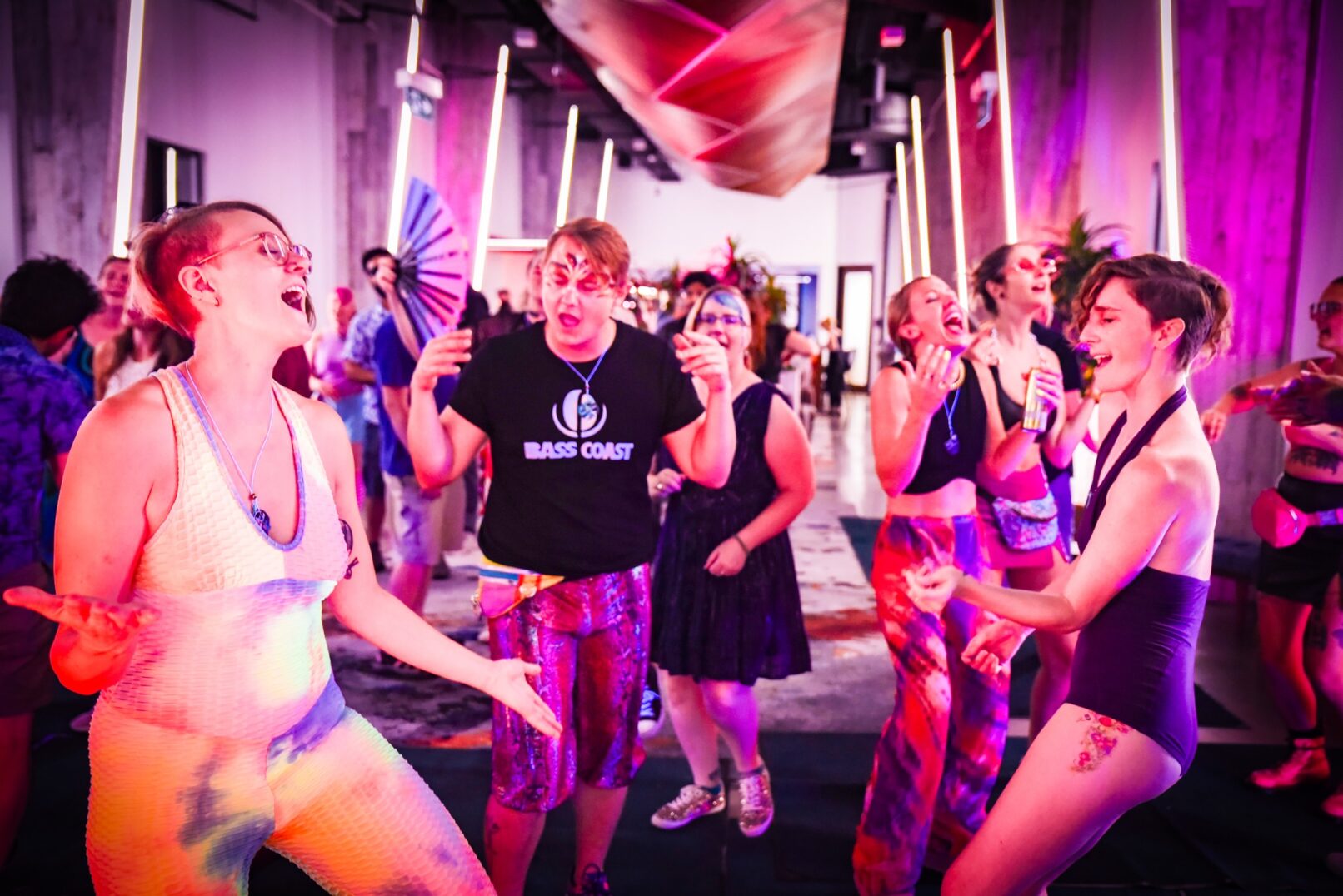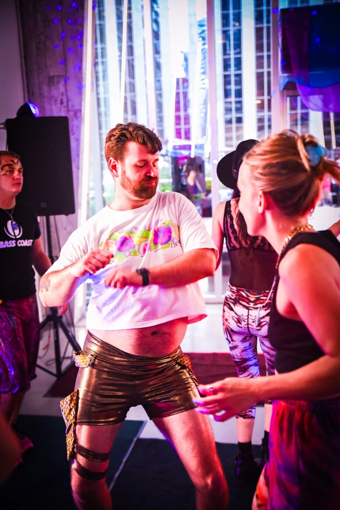 Guests are offered a consent-forward welcome experience as they enter, followed by an afternoon of joyful electronic music, and a cozy lounge filled with introvert- and extrovert-friendly activities and chances for connection. The first half of the day is “all ages”, allowing adults and little kids to dance alongside each other, both embracing their inner child. We program rotating hosted activities, from chair massages, to live art creation, to face painting. We invite guests to self-express with flamboyant clothing, and offer a ‘costume borrowing’ station for those wanting to glam up more. Our bar prioritizes non-alcoholic kombucha, coconut water, and cold-brew coffee. The dancing ends promptly at 8pm, when we downshift to a decompression hour to close out the day, and help guests ease back into the real world outside our borders.